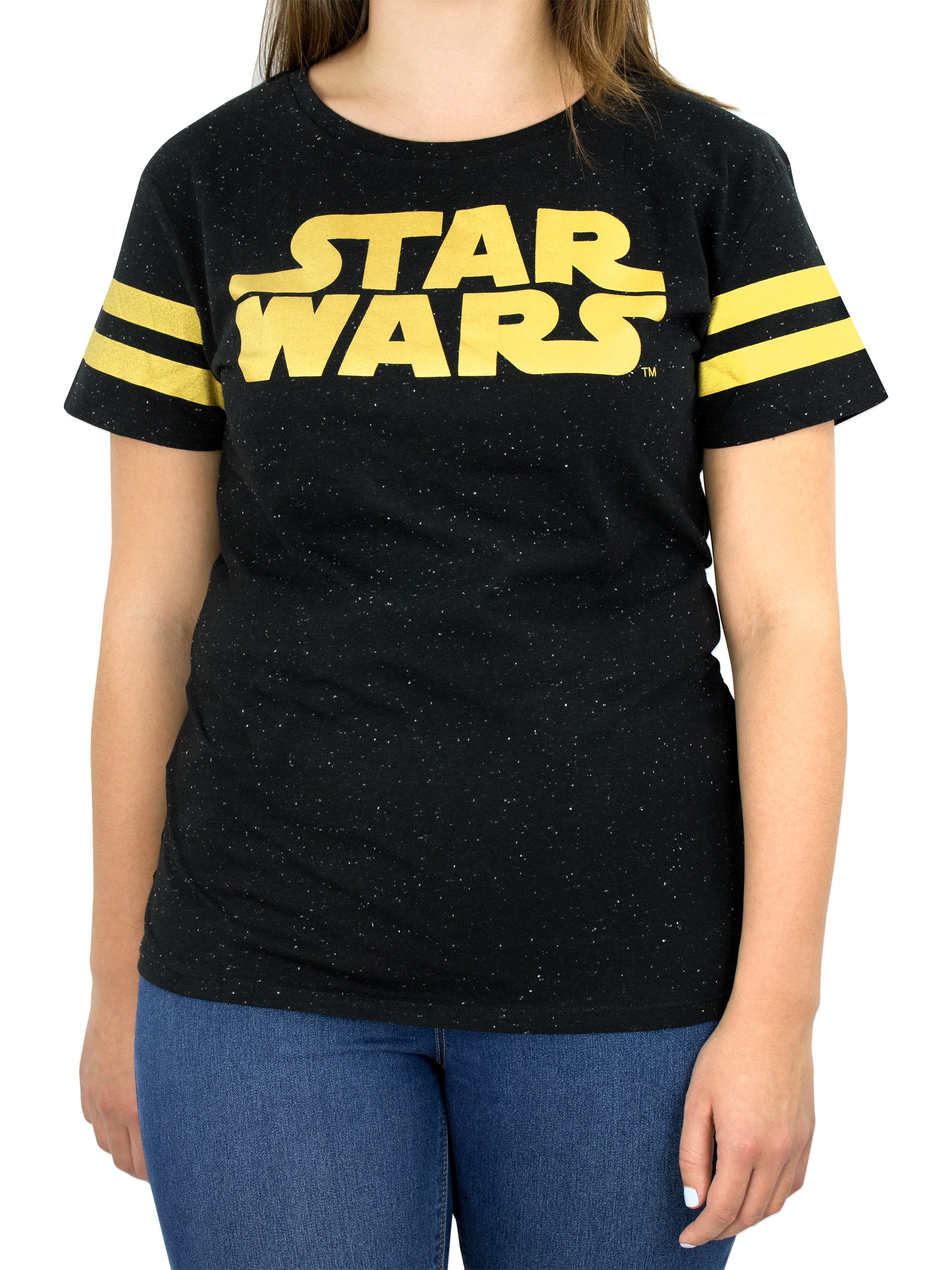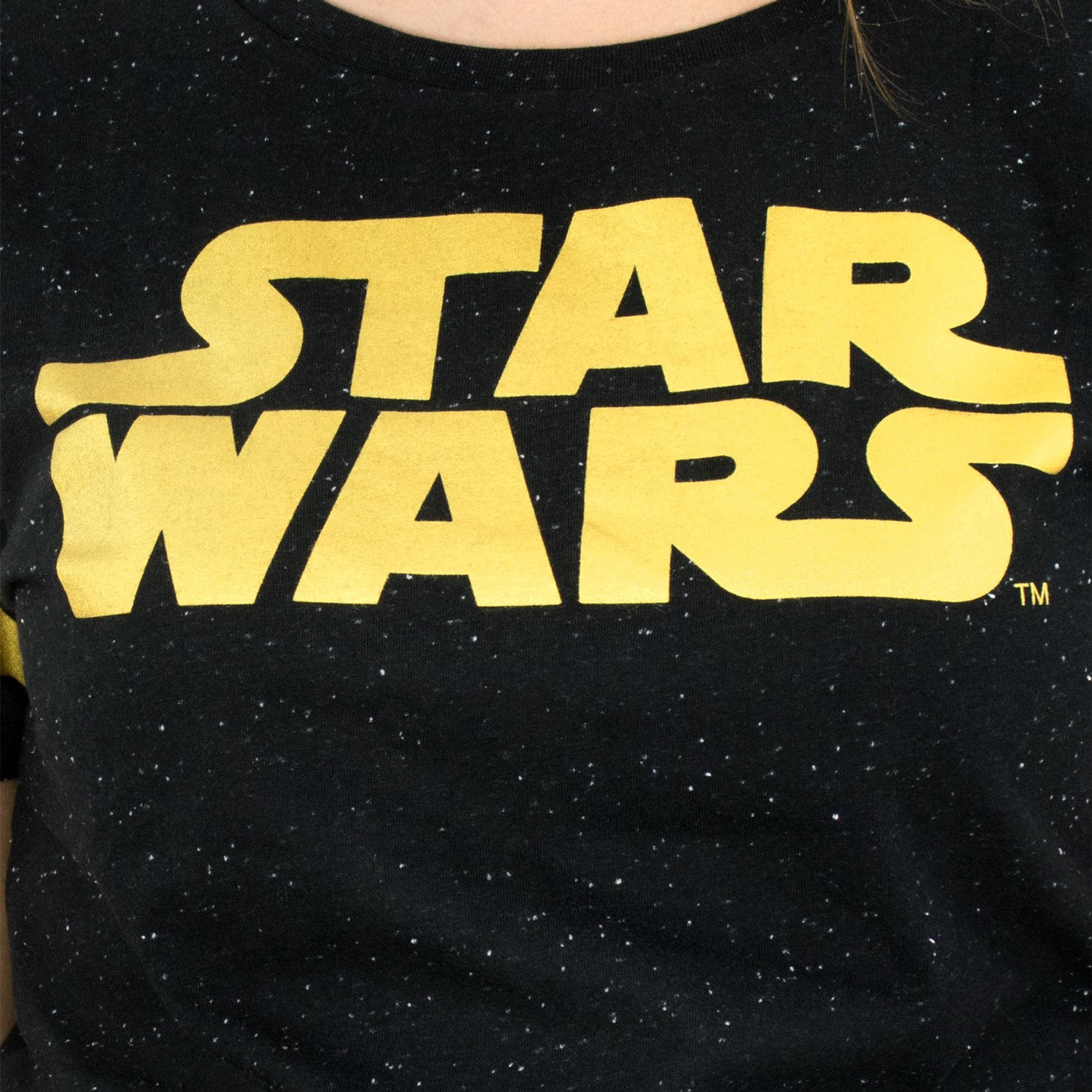 Star Wars T-Shirts für Frauen: Jeder Jediritter wird bereit sein, um den Rebellen beizustehen und dabei mit diesem Star Wars Shirt intergalaktisch gut auszusehen. Mit dem in Gold schimmernden Star Wars Logo über der Brust und den Streifen an den Ärmeln, ist dieses T-Shirt eines das Sie auf jedem Planeten in diesem Universum tragen können. Aus sanft, weichem Stoff gemacht, würde auch Prinzessin Leia diesen Look Tag und Nacht tragen wollen.