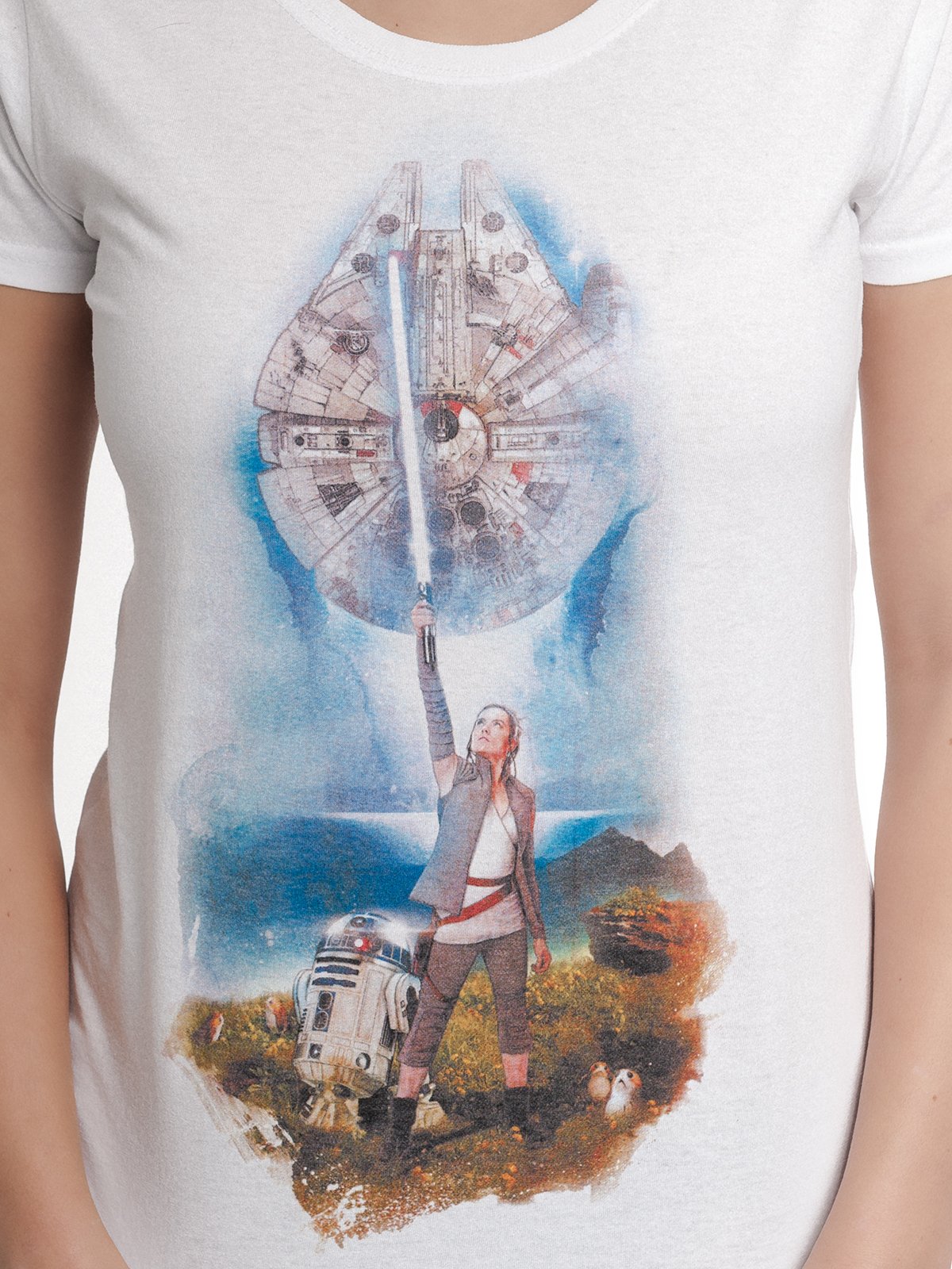 Der Frontprint zeigt Rey mit Lichtschwert und den Droiden R2D2