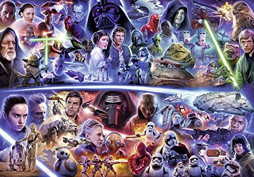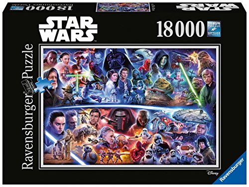 Die Puzzle von Ravensburger überzeugen sowohl durch Verarbeitung, Passgenauigkeit der Teile mit Softclick-Technologie und schöne Motive. Dieses riesige Puzzle für Erwachsene richtet sich an echte Puzzle-Profis und Fans der Filmserie Star Wars. Es besteht aus 18000 Teilen und zeigt verschiedene Szenen aus Star-Wars-Filmen. Das Puzzle ist etwa 276 x 192 Zentimeter groß.